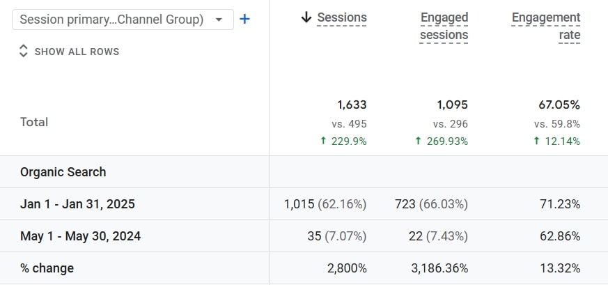 Сравнение органического трафика за май 2024 и январь 2025: