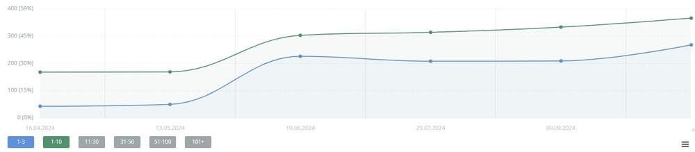 Спустя еще 4 месяца позиции выросли до 50% в топ-10 и до 30% в топ-3.