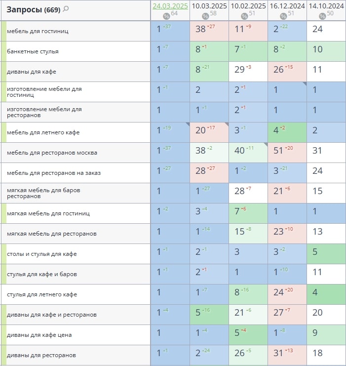 Сбор высокочастотных и среднечастотных запросов по теме изготовления и продажи мебели для кафе, ресторанов, ТЦ, офисов и т.д., оптимизация страниц сайта под запросы для их выведения в ТОП-10 выдачи поисковых систем.
